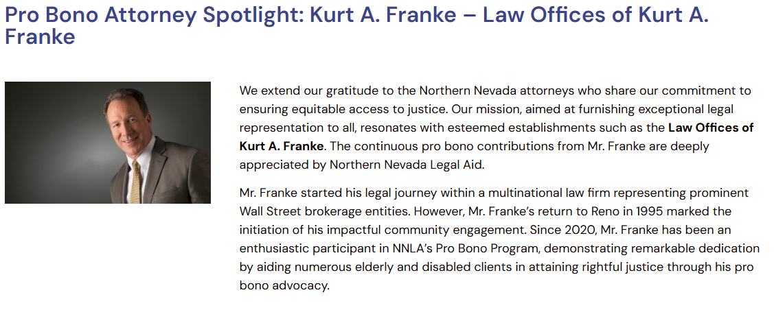 Kurt Franke began his law career in a multinational firm representing Wall Street brokerage companies. He always believed, however, that quality legal representation should be available to everyone - not just the rich. In 1995, Kurt moved back to Reno, Nevada to put his legal knowledge and experience to work for you: the honest individual in need of quality legal representation. Licensed in Nevada and California, Kurt Franke specializes in personal injury and business law.